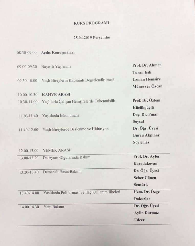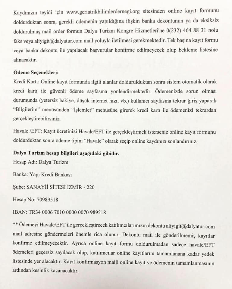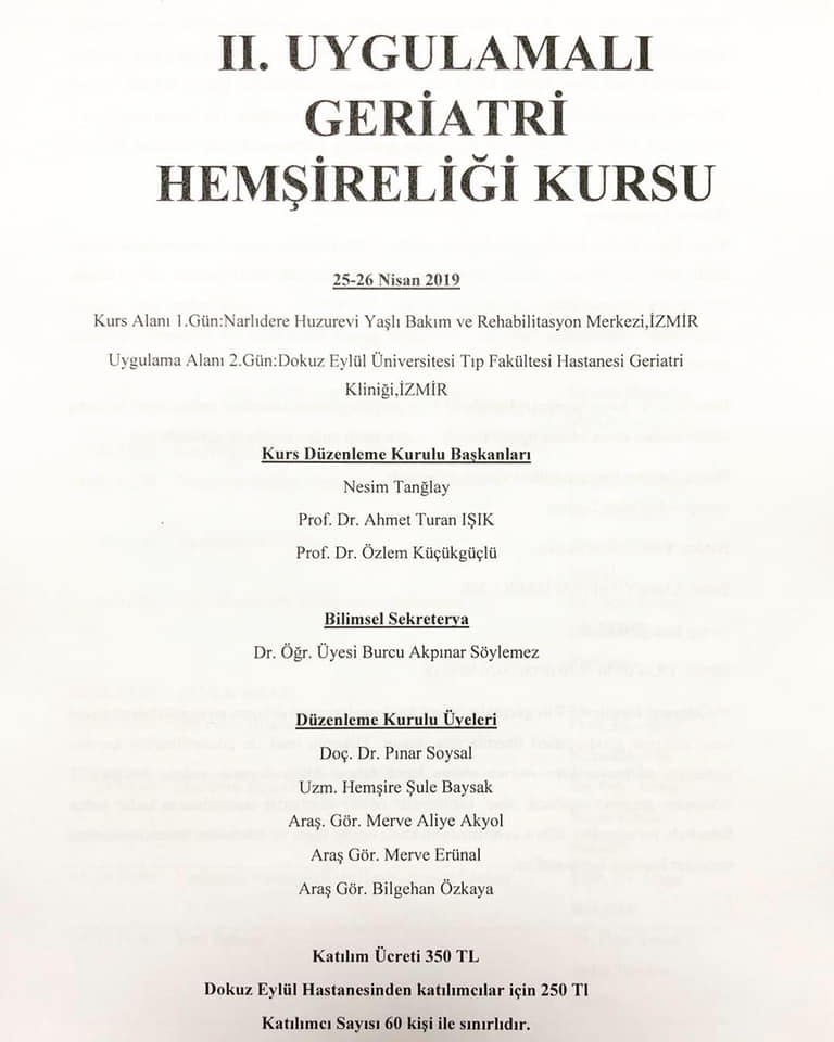 25-26 Nisan 2019 tarihlerinde düzenlenecek 2. UYGULAMALI GERİATRİ HEMŞİRELİĞİ KURSU’na ÖN kayıt için www.geriatrikbilimler.org adresinden online kayıt formu doldurduktan sonra dekontunuz ile birlikte aliyigit@dalyatur.com adresine mail atmanız gerekmektedir. Katılım kontenjanla sınırlıdır.